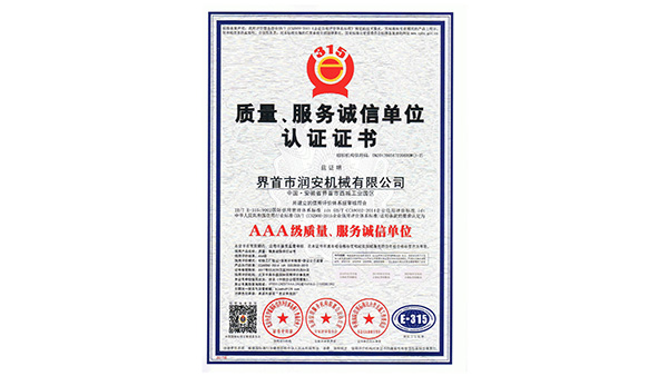 質(zhì)量、服務(wù)誠(chéng)信單位認(rèn)證證書公司已通過了ISO9001質(zhì)量管理認(rèn)證、ISO14001環(huán)境管理體系認(rèn)證和ISO45001職業(yè)健康安全管理體系認(rèn)證。為中國(guó)儲(chǔ)備糧管理總公司糧機(jī)設(shè)備的A級(jí)供應(yīng)商、安徽省高新技術(shù)企業(yè)、擁有阜陽(yáng)市企業(yè)技術(shù)中心。