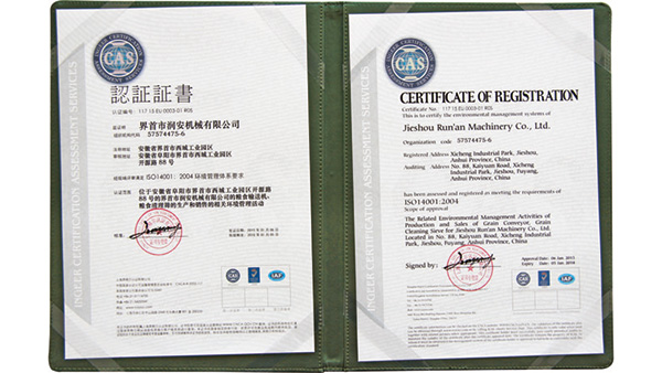 認(rèn)證證書公司已通過了ISO9001質(zhì)量管理認(rèn)證、ISO14001環(huán)境管理體系認(rèn)證和ISO45001職業(yè)健康安全管理體系認(rèn)證。為中國(guó)儲(chǔ)備糧管理總公司糧機(jī)設(shè)備的A級(jí)供應(yīng)商、安徽省高新技術(shù)企業(yè)、擁有阜陽(yáng)市企業(yè)技術(shù)中心。