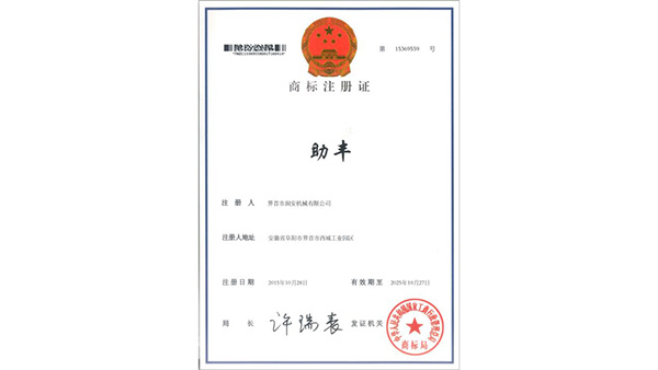 商標(biāo)注冊(cè)證書公司已通過了ISO9001質(zhì)量管理認(rèn)證、ISO14001環(huán)境管理體系認(rèn)證和ISO45001職業(yè)健康安全管理體系認(rèn)證。為中國(guó)儲(chǔ)備糧管理總公司糧機(jī)設(shè)備的A級(jí)供應(yīng)商、安徽省高新技術(shù)企業(yè)、擁有阜陽(yáng)市企業(yè)技術(shù)中心。