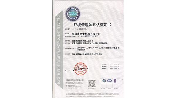 環(huán)境體系公司已通過了ISO9001質(zhì)量管理認(rèn)證、ISO14001環(huán)境管理體系認(rèn)證和ISO45001職業(yè)健康安全管理體系認(rèn)證。為中國(guó)儲(chǔ)備糧管理總公司糧機(jī)設(shè)備的A級(jí)供應(yīng)商、安徽省高新技術(shù)企業(yè)、擁有阜陽(yáng)市企業(yè)技術(shù)中心。