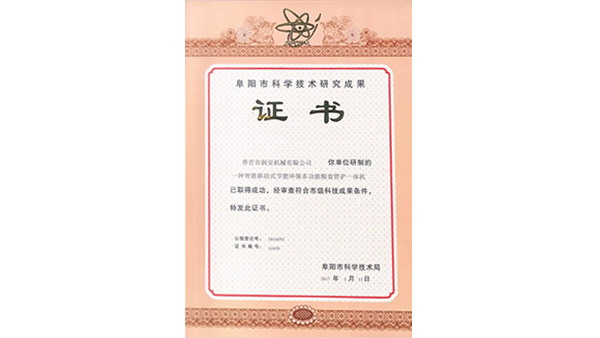 科技成果證書公司已通過了ISO9001質(zhì)量管理認(rèn)證、ISO14001環(huán)境管理體系認(rèn)證和ISO45001職業(yè)健康安全管理體系認(rèn)證。為中國(guó)儲(chǔ)備糧管理總公司糧機(jī)設(shè)備的A級(jí)供應(yīng)商、安徽省高新技術(shù)企業(yè)、擁有阜陽(yáng)市企業(yè)技術(shù)中心。