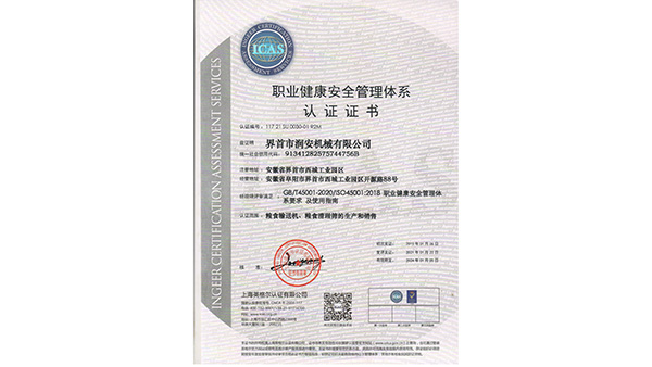 職業(yè)健康體系公司已通過了ISO9001質(zhì)量管理認(rèn)證、ISO14001環(huán)境管理體系認(rèn)證和ISO45001職業(yè)健康安全管理體系認(rèn)證。為中國(guó)儲(chǔ)備糧管理總公司糧機(jī)設(shè)備的A級(jí)供應(yīng)商、安徽省高新技術(shù)企業(yè)、擁有阜陽(yáng)市企業(yè)技術(shù)中心。
