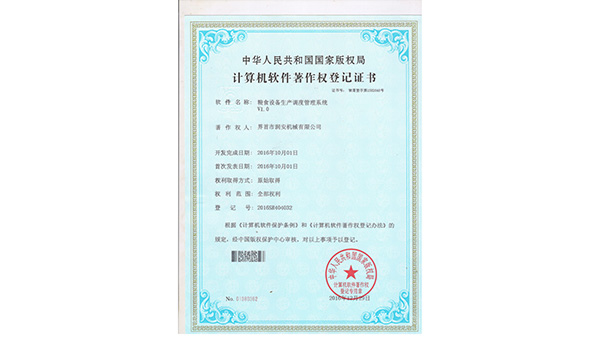 著作登記公司已通過了ISO9001質(zhì)量管理認(rèn)證、ISO14001環(huán)境管理體系認(rèn)證和ISO45001職業(yè)健康安全管理體系認(rèn)證。為中國(guó)儲(chǔ)備糧管理總公司糧機(jī)設(shè)備的A級(jí)供應(yīng)商、安徽省高新技術(shù)企業(yè)、擁有阜陽(yáng)市企業(yè)技術(shù)中心。